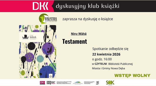 22 kwietnia 2026 r. o godz. 16:00 w czytelni Biblioteki Publicznej Miasta i Gminy Nowa Dęba mieszczącej się w Samorządowym Ośrodku Kultury w Nowej Dębie odbędzie się kolejne spotkanie Dyskusyjnego Klubu Książki. Tym razem członkowie Klubu dyskutować będą o książce Niny Wähä „Testament”. Nina Wähä to urodzona w Sztokholmie w 1979 roku szwedzka pisarka, aktorka i piosenkarka. Zadebiutowała w 2007 roku. Pomysł na napisanie „Testamentu” przyszedł, gdy jej babcia zachorowała na Alzheimera. Pisarka chciała utrwalić rodzinne historie i fińską Dolinę Tornio – miejsce, w którym w młodości spędzała wakacje. Osadziła…