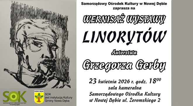 W sali kameralnej Samorządowego Ośrodka Kultury w Nowej Dębie w dniu 23 kwietnia 2026 r. o godz. 18:00 odbędzie się wernisaż wystawy grafiki Grzegorza Gerby pt. „W świecie czerni i bieli”. Grzegorz Gerba jest absolwentem Państwowego Liceum Sztuk Plastycznych w Nowym Wiśniczu, gdzie uzyskał dyplom na Wydziale Ceramiki Artystycznej. Ukończył również Instytut Wychowania Plastycznego Akademii Pedagogicznej w Krakowie, zdobywając dyplom z grafiki warsztatowej w pracowni Jana Bujnowskiego. Na co dzień pracuje jako nauczyciel w Szkole Podstawowej nr 4 w Tarnobrzegu, gdzie dzieli się swoją wiedzą i doświadczeniem z młodszymi pokoleniami.…