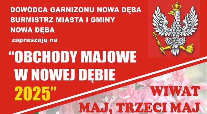 Dowódca Garnizonu Nowa Dęba i Burmistrz Miasta i Gminy Nowa Dęba zapraszają na „OBCHODY MAJOWE W NOWEJ DĘBIE 2025” / WIWAT MAJ, TRZECI MAJ. 2 maja – Dzień Flagi Rzeczpospolitej Polskiej: godz. 11:30 – Przemarsz Orkiestry Dętej Miasta i Gminy Nowa Dęba ulicami: Krasickiego – Aleja Zwycięstwa;godz. 12:00 – Uroczyste wciągnięcie Flagi Państwowej na maszt na Placu mjr. Gryczmana z udziałem Wojskowej Asysty Honorowej, okolicznościowe wystąpienia;godz. 13:00 – Witaj Maj, 3 Maj! koncert Orkiestry Dętej Miasta i Gminy Nowa Dęba, scena plenerowa Samorządowego Ośrodka Kultury w Nowej Dębie;godz. 13:00 –…