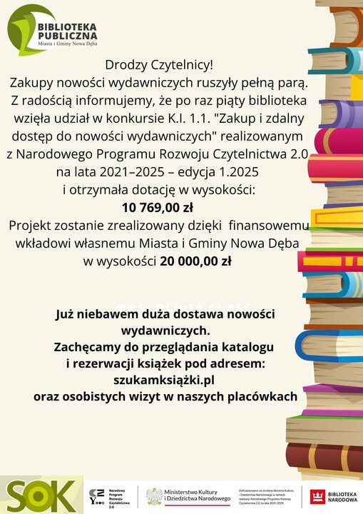 W naszej Bibliotece Publicznej Miasta i Gminy Nowa Dęba pojawia się wiele nowych pozycji polskiej i światowej literatury dzięki otrzymanej dotacji 10 769,00 zł w wyniku udziału (po raz piąty) w konkursie K.I. 1.1. „Zakup i zdalny dostęp do nowości wydawniczych” realizowanym z Narodowego Programu Rozwoju Czytelnictwa 2.0 na lata 2021-2025 – edycja 1.2025.